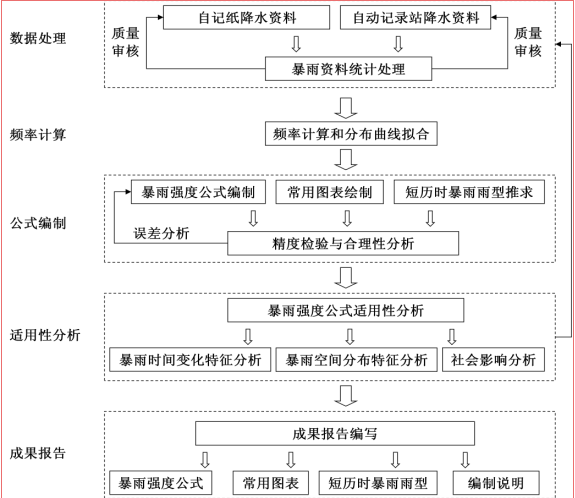 呼和浩特市暴雨強(qiáng)度公式編制的主要內(nèi)容包括資料處理、單一重現(xiàn)期暴雨強(qiáng)度公式擬合、區(qū)間參數(shù)公式擬合、暴雨強(qiáng)度總公式擬合、常用查算圖表編制、精度檢驗(yàn)、各強(qiáng)度暴雨時(shí)間變化特征和暴雨強(qiáng)度空間分布特征分析等內(nèi)容,具體流程如下: