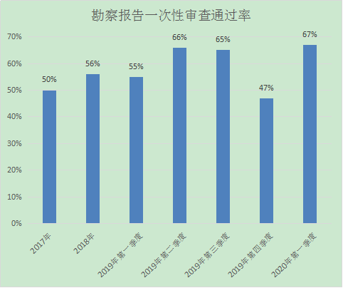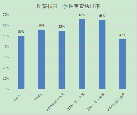 2019年第四季度我中心審查勘察報告共64項次,勘察報告一次性審查通過30項次,一次性審查通過率為47%,與往年勘察報告一次性審查通過率對比分析如下: