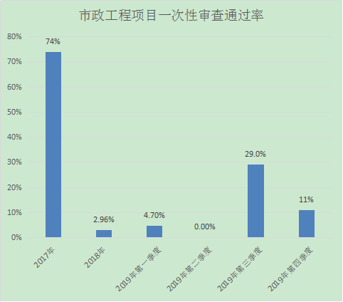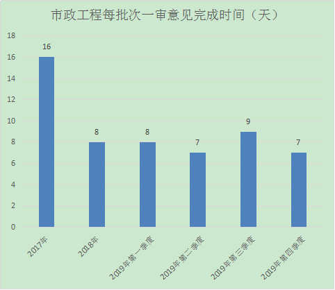2019年第三季度我中心市政工程項目共審查9項,一次性審查通過1項,一次性審查通過率為11%;每批次一審意見完成時間為7天,與往年對比分析如下:
