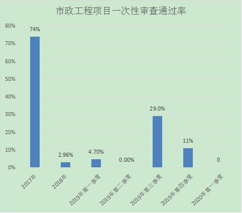 2020年第一季度我中心市政工程項目共審查1項,一次性審查通過0項,一次性審查通過率為0%;每批次一審意見完成時間為1天,與往年對比分析如下: