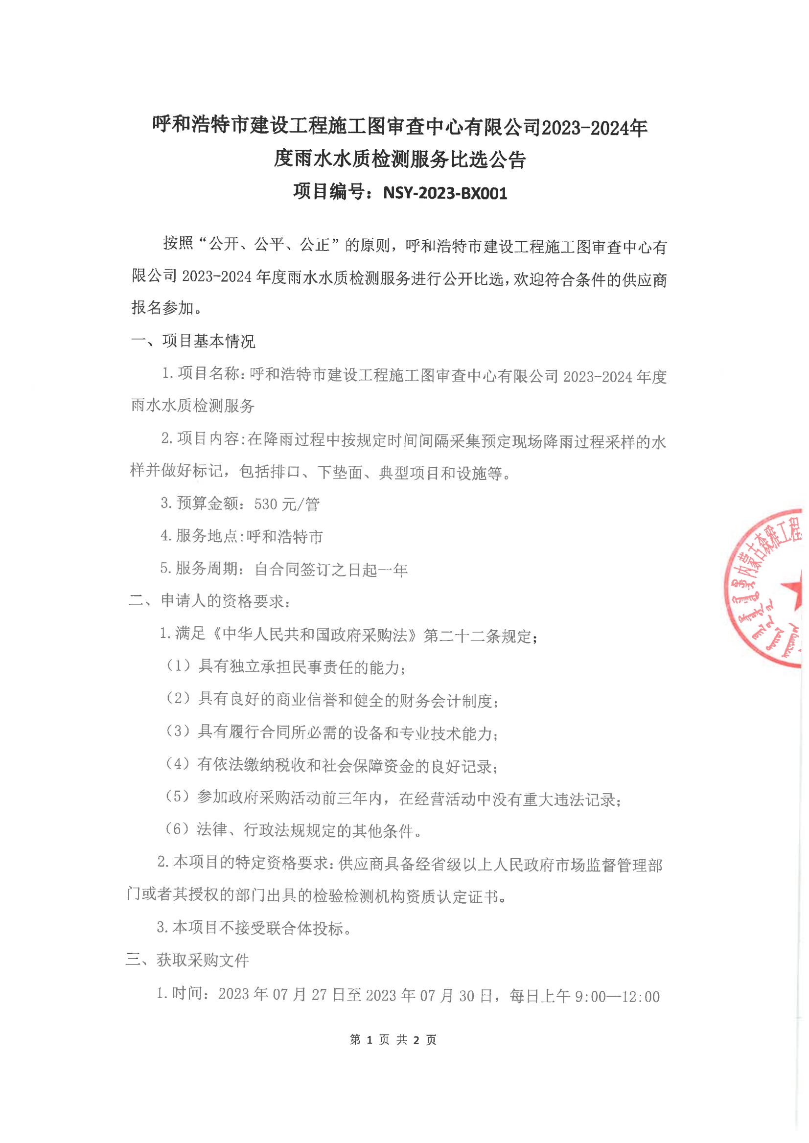 呼和浩特市建設(shè)工程施工圖審查中心有限公司2023-2024年度雨水水質(zhì)檢測服務(wù)比選公告